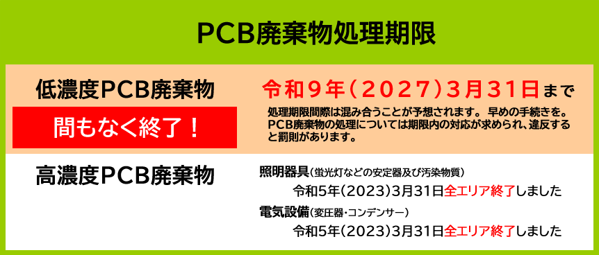 2023-03-31 / 最終更新日時 : 2026-04-10 管理者 お知らせ 高濃度PCB処分期限 令和5年3月31日 令和5年(2023)3月31日をもって、高濃度PCB廃棄物はすべてのエリアで、処分期限を終了しました。 低濃度PCB廃棄物は、令和9年3月31日が処分期限となります。 環境省ホームページ https://policies […]